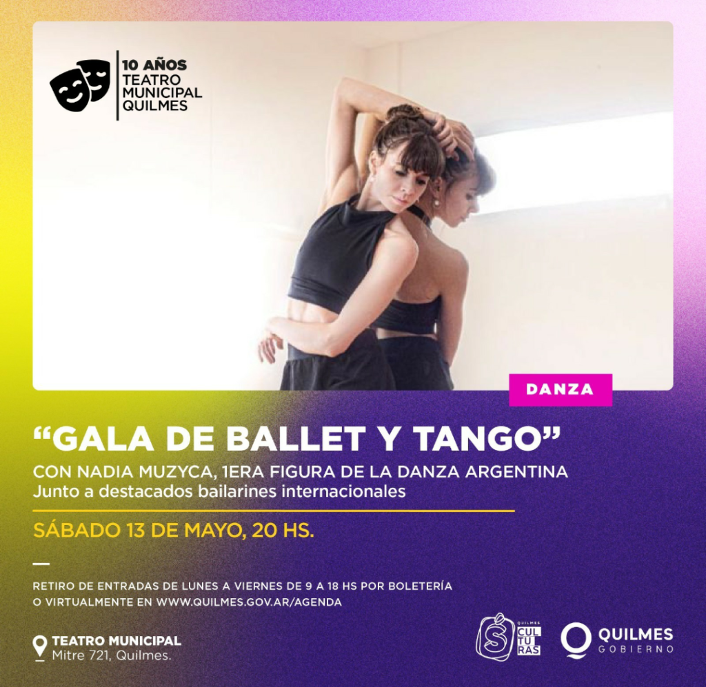 El sábado 13 a las 20, en el Teatro Municipal, será la Gala de Ballet y Tango con Nadia Muzyca, junto a Omar Mazzei, en un espectáculo de danzas donde se representan clásicos de ballet, y el tangos de Astor Piazzolla, con el protagonismo de la ex primera bailarina del Teatro Colón.