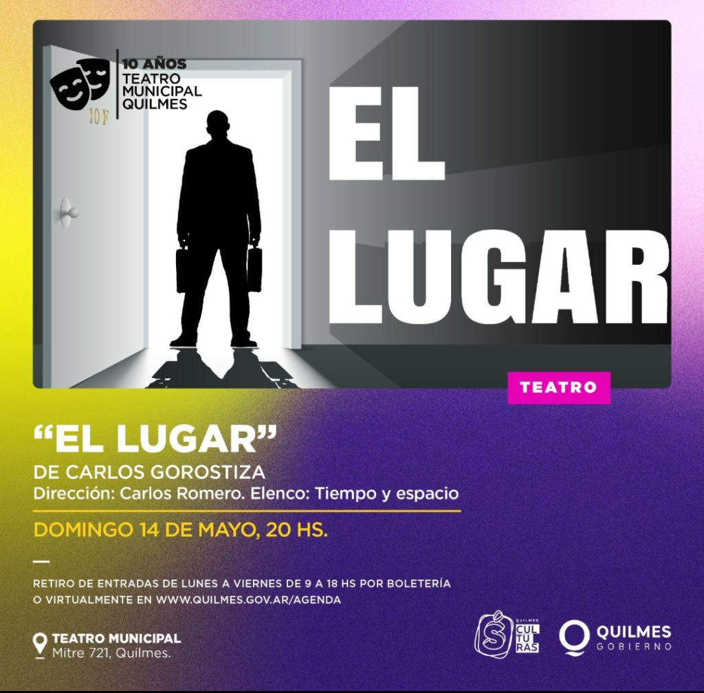 - A las 20, con la obra teatral El Lugar, del distinguido dramaturgo Carlos Gorotiza, con actuaciones de Elías Jalí, Analía Lobello, Diego La Cámera, Carlos Romero, Marcela Mateos, Diego Noain, Federico Rojas, y la dirección de Carlos Romero.
