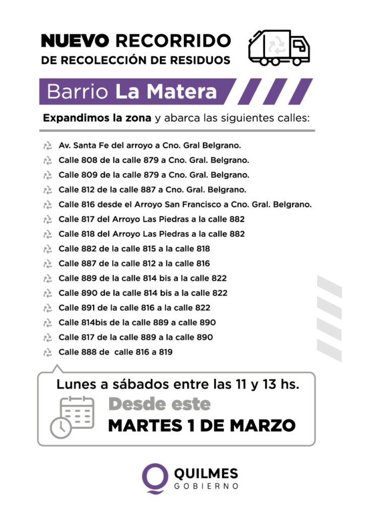 El Municipio informa que, gracias al Plan de Asfaltos de 400 cuadras impulsado por la Jefa comunal Mayra Mendoza desde el comienzo de su gestión en los distintos barrios del distrito, a partir del corriente mes de marzo, en el barrio La Matera, de Quilmes Oeste, se implementa un nuevo recorrido para la recolección de residuos domiciliarios, de lunes a sábado entre las 11 y las 13.