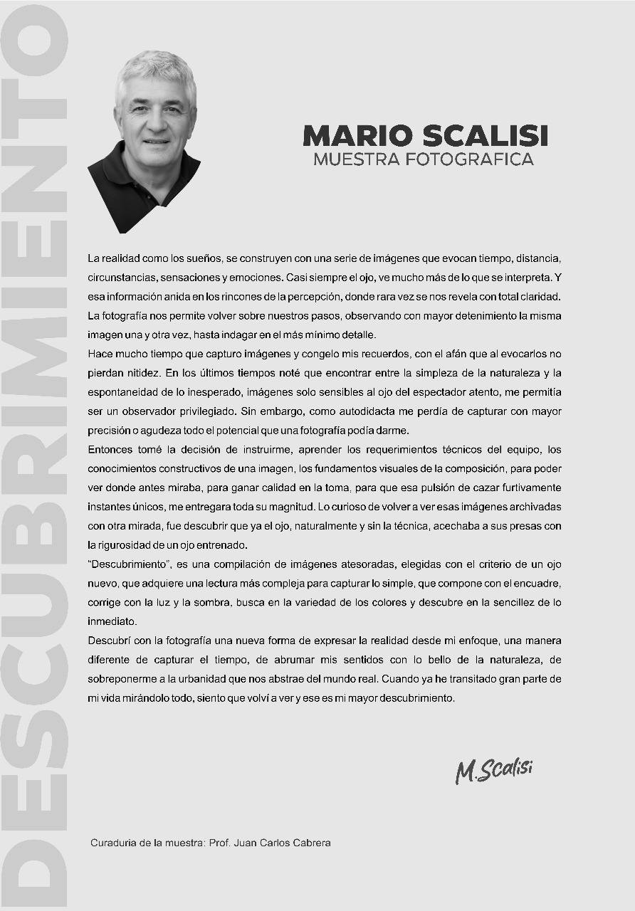 El arquitecto y dirigente político Mario Scalisi inauguró su muestra fotográfica este miércoles 17 en Casa de Arte Doña Rosa, donde se pudo degustar pastas y un buen vino mientras se apreciaron sus fotos, cuya exhibición permanecerá hasta el 12 de octubre.