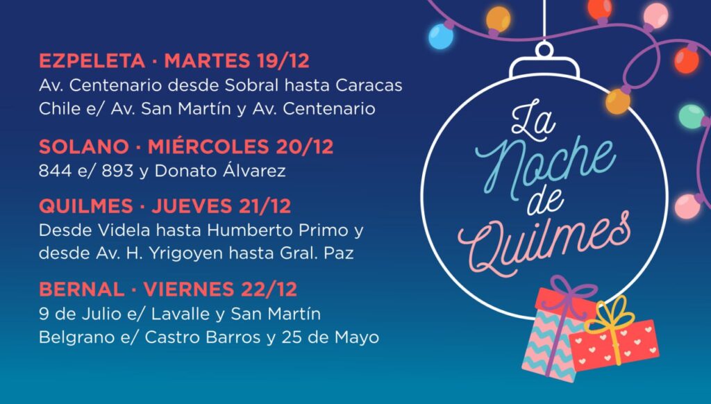 Desde el martes 19 de diciembre al viernes 22 se llevará adelante «La Noche de Quilmes» en los principales centros comerciales del distrito, en los que vecinas y vecinos podrán comprar regalos de Navidad con descuentos y rebajas. Cada localidad tendrá asignada una jornada, en el horario de 18 a 23. Habrá beneficios especiales para los poseedores de la tarjeta Somos Quilmes.