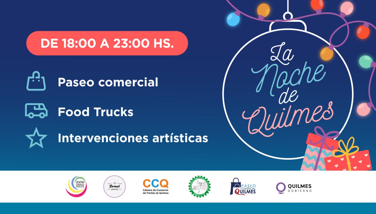 Desde el martes 19 de diciembre al viernes 22 se llevará adelante «La Noche de Quilmes» en los principales centros comerciales del distrito, en los que vecinas y vecinos podrán comprar regalos de Navidad con descuentos y rebajas. Cada localidad tendrá asignada una jornada, en el horario de 18 a 23. Habrá beneficios especiales para los poseedores de la tarjeta Somos Quilmes.