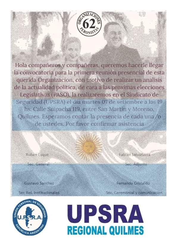 Hoy, 7 de septiembre, a las 19 horas se hará el cierre de campaña del Sindicato de Personal de Seguridad de la República Argentina en la delegación Quilmes, Suipacha 119. Allí, Las 62 Organizaciones gremiales peronistas participan de este cierre, con la presentación de candidatos del Movimiento Obrero que adhieren al Frente de Todos.