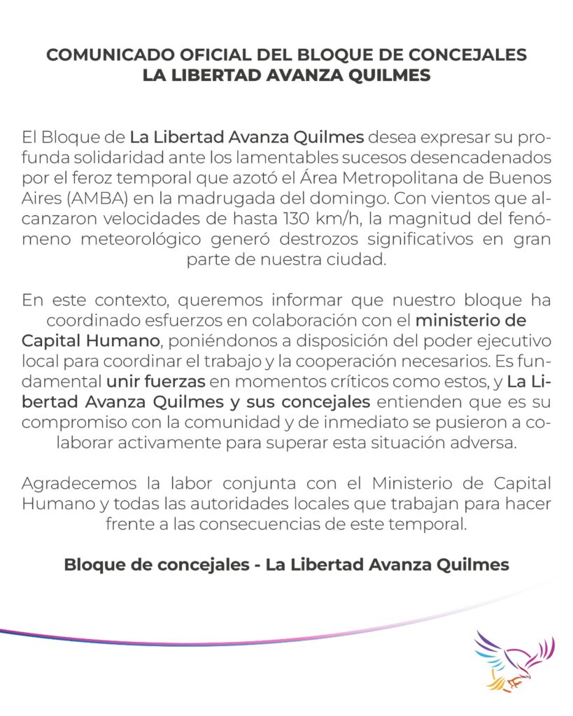 El Bloque de La Libertad Avanza Quilmes desea expresar su profunda solidaridad ante los lamentables sucesos desencadenados por el feroz temporal que azotó el Área Metropolitana de Buenos Aires (AMBA) en la madrugada del domingo. Con vientos que alcanzaron velocidades de hasta 130 km/h, la magnitud del fenómeno meteorológico generó destrozos significativos en gran parte de nuestra ciudad.
