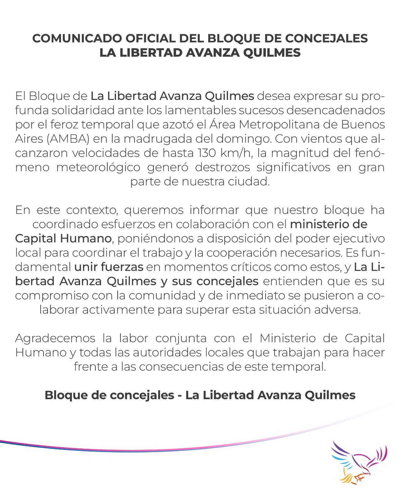 El Bloque de La Libertad Avanza Quilmes desea expresar su profunda solidaridad ante los lamentables sucesos desencadenados por el feroz temporal que azotó el Área Metropolitana de Buenos Aires (AMBA) en la madrugada del domingo. Con vientos que alcanzaron velocidades de hasta 130 km/h, la magnitud del fenómeno meteorológico generó destrozos significativos en gran parte de nuestra ciudad.