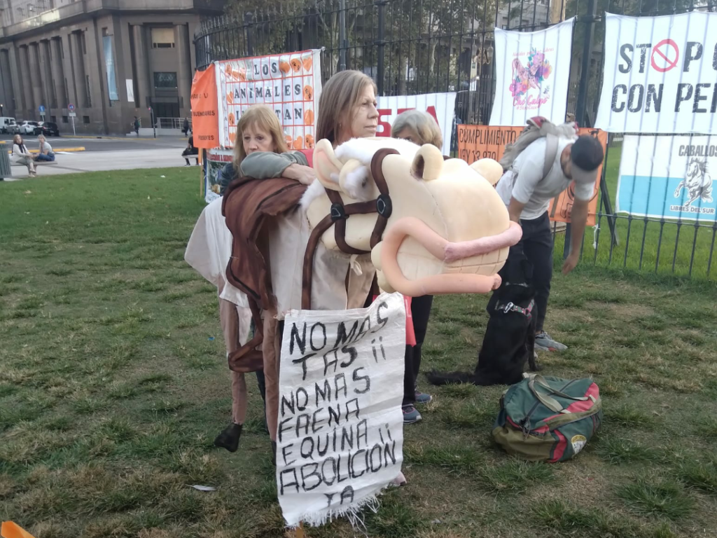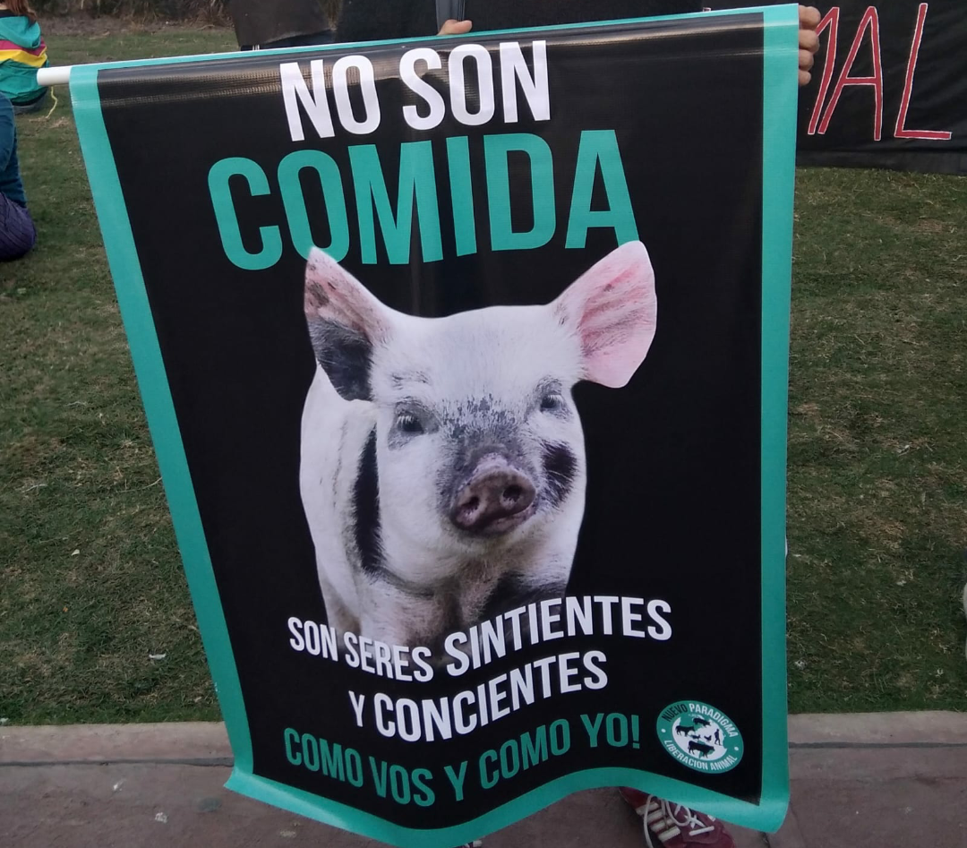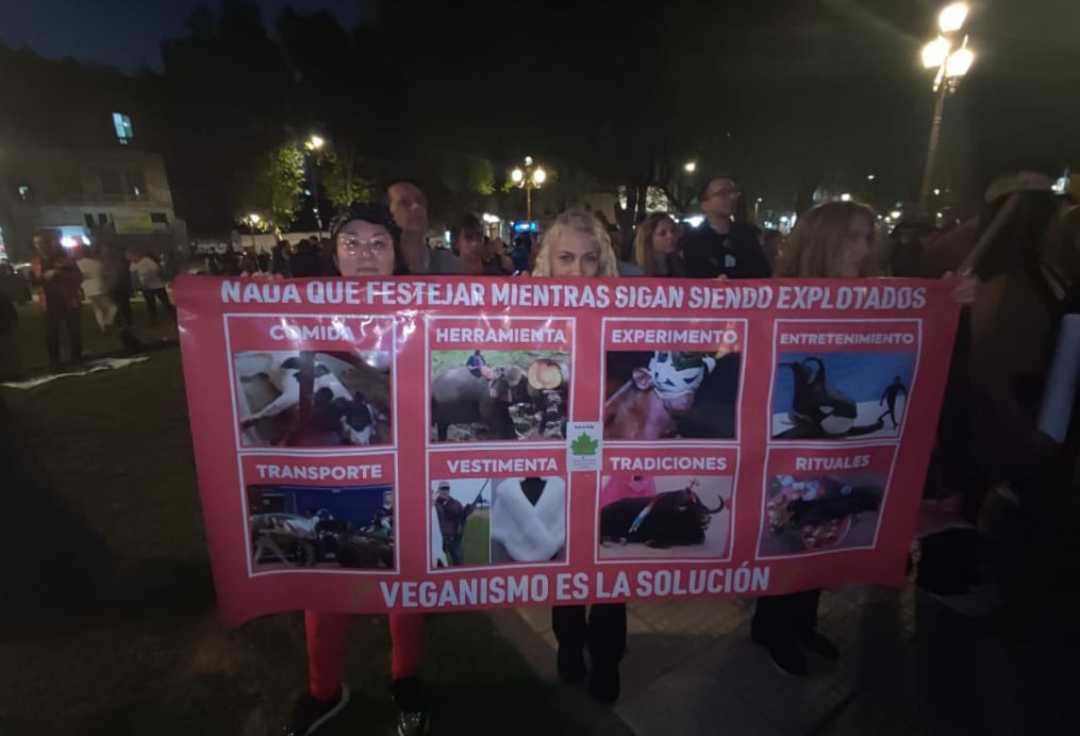 También veganos colgarons sus pancartas en las rejas de la plaza del edificio legislativo, recomendando el no consumo de animales.