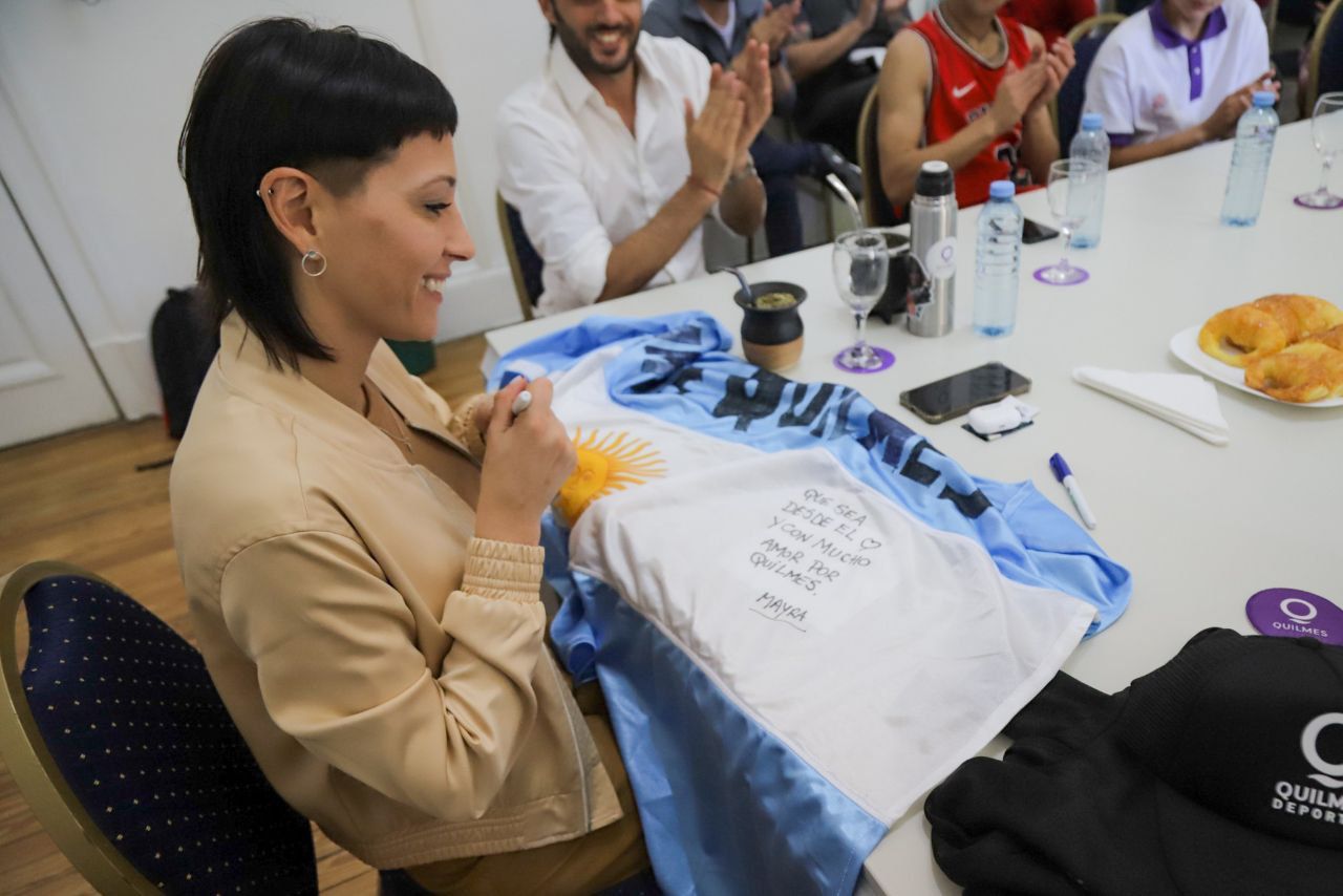 En el encuentro, la Jefa Comunal conversó con ellos sobre la competencia y les transmitió el saludó para el resto de los integrantes del equipo quilmeño. Junto a Mayra estuvieron los y las siguientes deportistas: