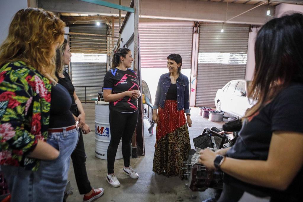 «Hoy visitamos el taller mecánico también para que las chicas que lo llevan adelante se sientan acompañadas en esta tarea que vienen dando para ir ganando terreno en un ámbito muy de varones, cosa que hace todo muy dificultoso, y que queremos que se sientan acompañadas por un Estado que todos los días intenta llevar adelante una gestión feminista, transversalmente a todas sus áreas, no solamente a la Secretaría de Mujeres y Diversidades».