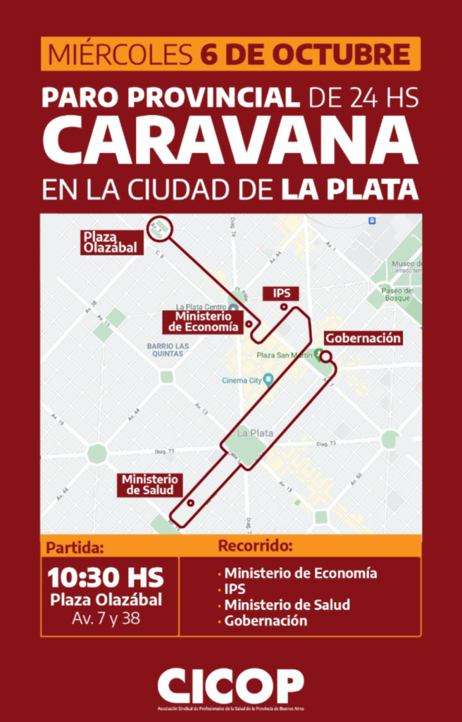 Médicos nucleados en el gremio CICOP resolvieron, luego de una consulta con profesionales que desarrollan su actividad en hospitales provinciales, realizar un paro por 24 horas con una serie de actividades para este miércoles que se iniciará con una caravana de autos hacia La Plata, con paradas en el Ministerio de Salud; el Instituto de Previsión Social (IPS), culminando con un acto frente a la Gobernación. Así lo informó el doctor bioquímico Sebastián Galiñanes, presidente de CICOP Quilmes, y Jefe de Sala de Bacteriología del Hospital Iriarte.