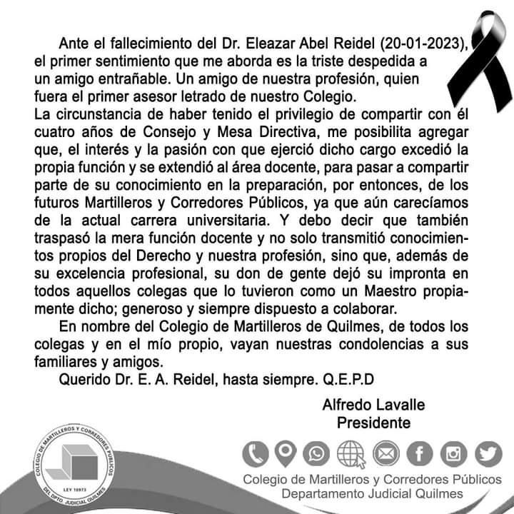 El Colegio de Abogados de Quilmes informó el fallecimiento del Dr. Eleazar Abel Reidel, quien participara en la conformación del Centro de Abogados de Quilmes y desde ese lugar, luchó con fervor para crear el Departamento Judicial, impulsando la ley de creación y participando con el conjunto de las comunidades de Quilmes, Varela y Berazategui. Fue el primer presidente del Colegio Departamental e integró la Cámara Civil y Comercial del Departamento.