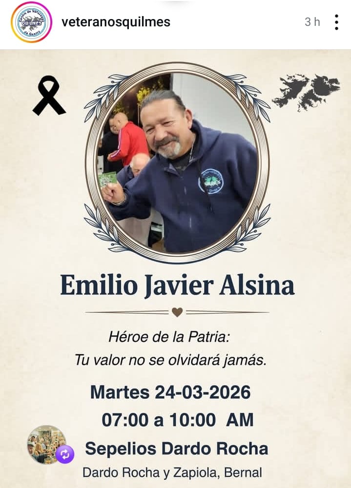 «Hoy lamentamos la partida de Emilio Javier Alsina, Veterano de Guerra de Malvinas, integrante de la Escuadrilla Aeronaval de Tracker, embarcado en 1982 en el portaaviones 25 de Mayo. Te recordamos con orgullo y profundo respeto. Fuiste parte de una generación que entregó todo por la Patria, con valor, compromiso y honor. Tu historia no se apaga, vive en la memoria de quienes no olvidamos, en cada bandera que se alza y en cada corazón agradecido. Descansá en paz, camarada. Tu misión está cumplida».