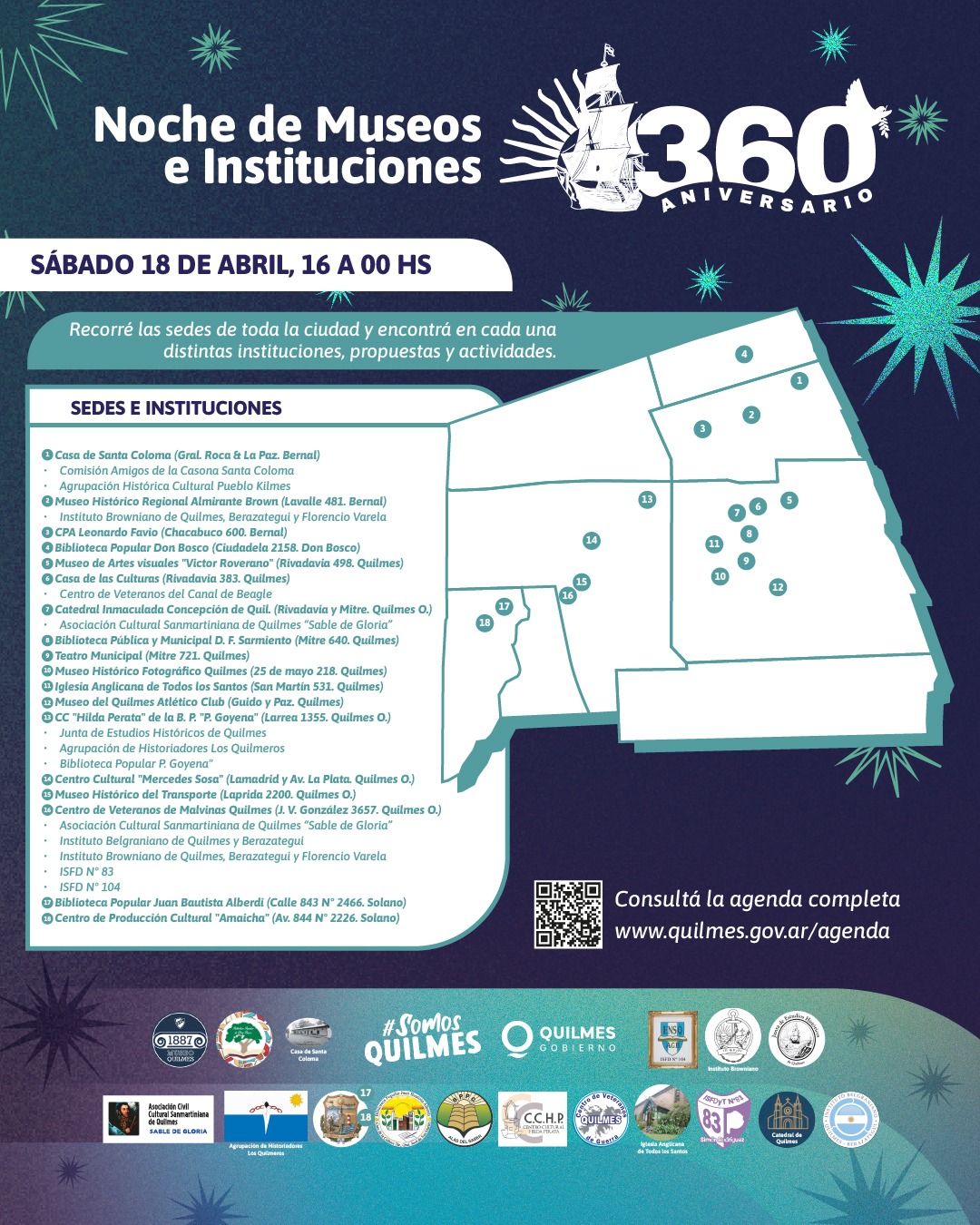 El Municipio informa que este sábado 18, de 16 a 24, se llevará adelante una nueva edición de La Noche de Museos e Instituciones Quilmes 360, una propuesta impulsada junto al Consejo Consultivo de Patrimonio, Identidades Quilmeñas y Memoria, de entrada libre y gratuita para los vecinos y vecinas.