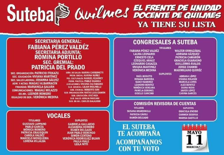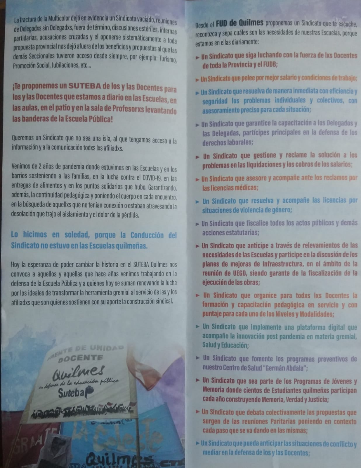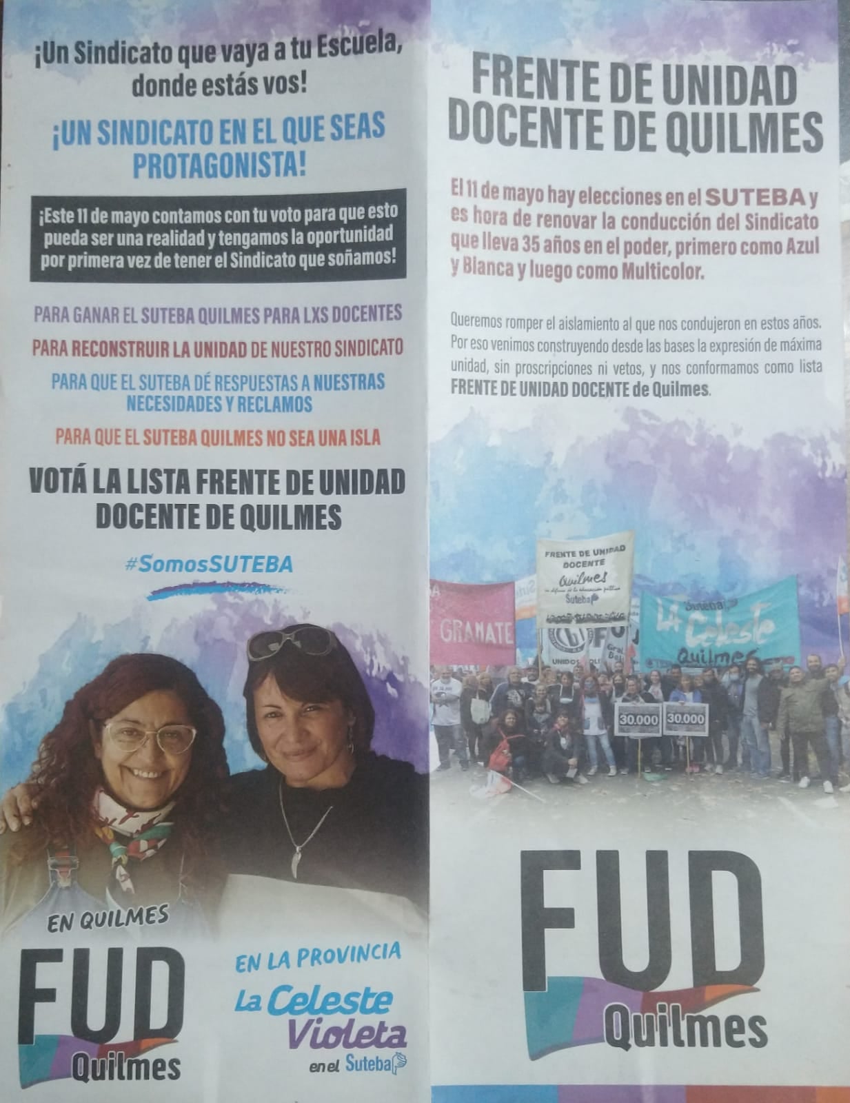 Soy docente jubilado y profesor del ISFD y T N° 24 de Bernal, en actividad. Esta es la Lista que integro y su propuesta. Formé parte de la primera conducción del SUTEBA en Quilmes en 1988 y, desde entonces, siempre milité en el sindicato, ocupando distintas responsabilidades a nivel local, provincial, Congresal en CTERA y en la Mesa de la CTA. Desde 2008, en que la mayoría del Consejo Ejecutivo de Quilmes se sumó a la pelea de las patronales agrarias contra las retenciones y se opuso a la estatización de las AFJP, la seccional perdió el rumbo, se degradó el trabajo sindical con las consecuentes desafiliaciones y se entró en un aislamiento respecto del SUTEBA provincial, que perjudicó enormemente a la docencia quilmeña. Desde entonces, venimos construyendo una articulación de la oposición, que hoy se expresa en el Frente de Unidad Docente (FUD). La división de la actual conducción Multicolor / Azul y Blanca favorece las posibilidades electorales para quienes bregamos por revertir ese triste deterioro sindical. Esperamos contar con tu voto y el 11 de mayo no te olvides del DNI. Si no sabés dónde votás, podés escribirme por privado y te informo.