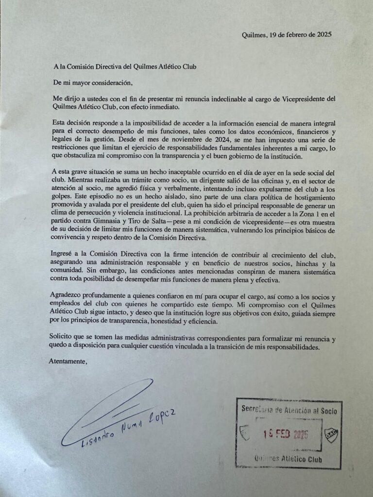 El CIQ se comunicó con el entorno de Lisandro López para que diera su versión, mas aún no ha respondido. Hace instantes, presentó su dimisión indeclinable al cargo de forma escrita
