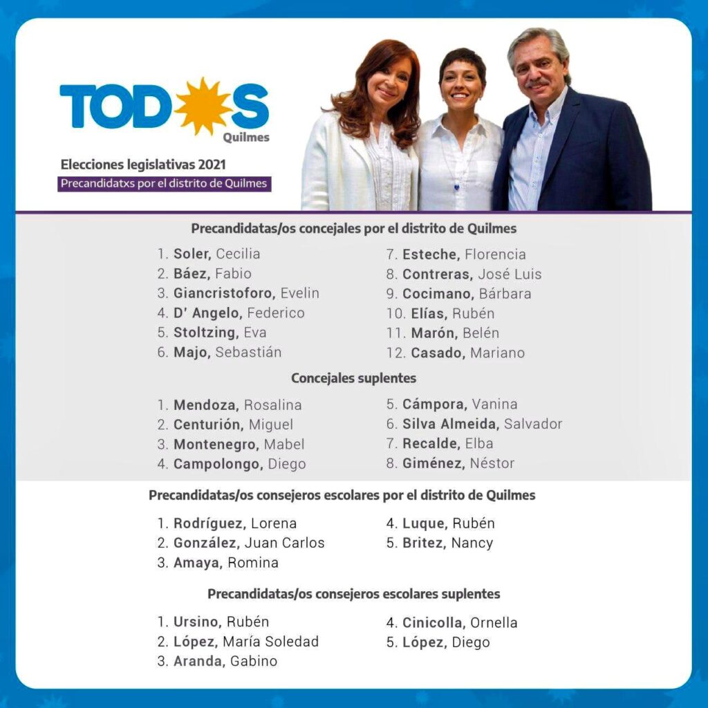 El Frente de Todos de Quilmes continuará sin diputados nacionales ni provinciales. El único que integrará la lista y en lugar 22 es el actual secretario de Servicios Públicos, referente junto a Daniel Gurzi de Juntos por Quilmes. El lugar no tiene expectativa de entrar y para que llegue a la banca depende de renuncias de quienes están en los primeros lugares. Un premio consuelo.