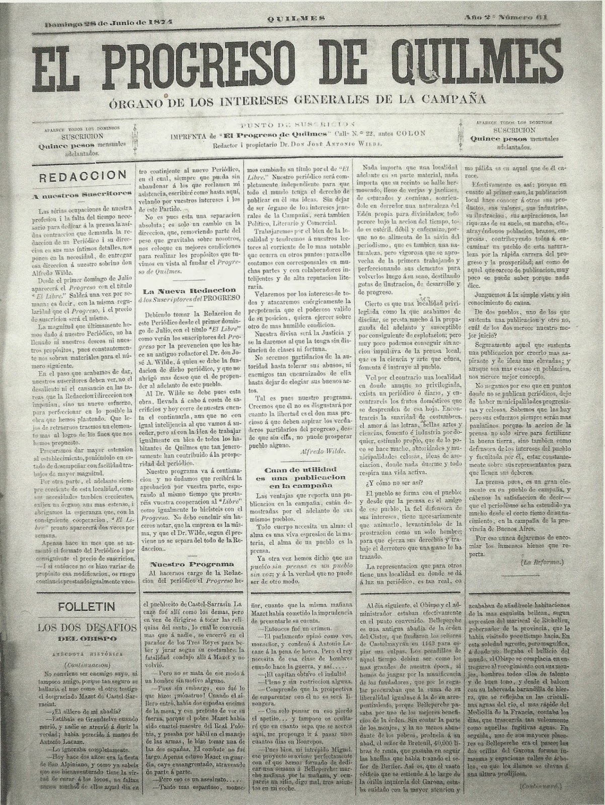 Wilde, amigo y admirador de Domingo Faustino Sarmiento bautizó a su periódico quilmeño como el que fundara en Chile el genial y polémico educador. Y fue providencial, pues su aparición abrió una puerta de progreso lenta pero constante en aquel pueblo de campaña que llegaría a ser una de las primeras ciudades industriales.