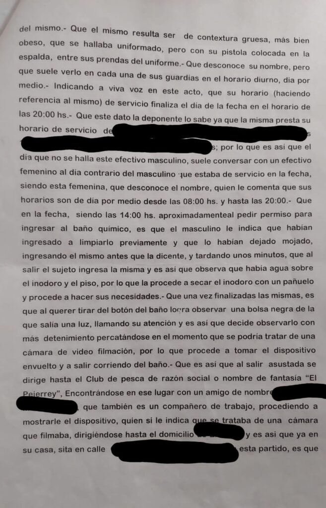 Según consta en la denuncia, la joven descubrió que algo raro sucedía cuando vio entrar al policía al baño químico. Luego de unos minutos salió, y ella le consultó a él si podía ingresar. Cuando lo hizo, le llamó la atención una bolsa negra ubicada al lado del inodoro.-ADVERTISEMENT-javascript:false