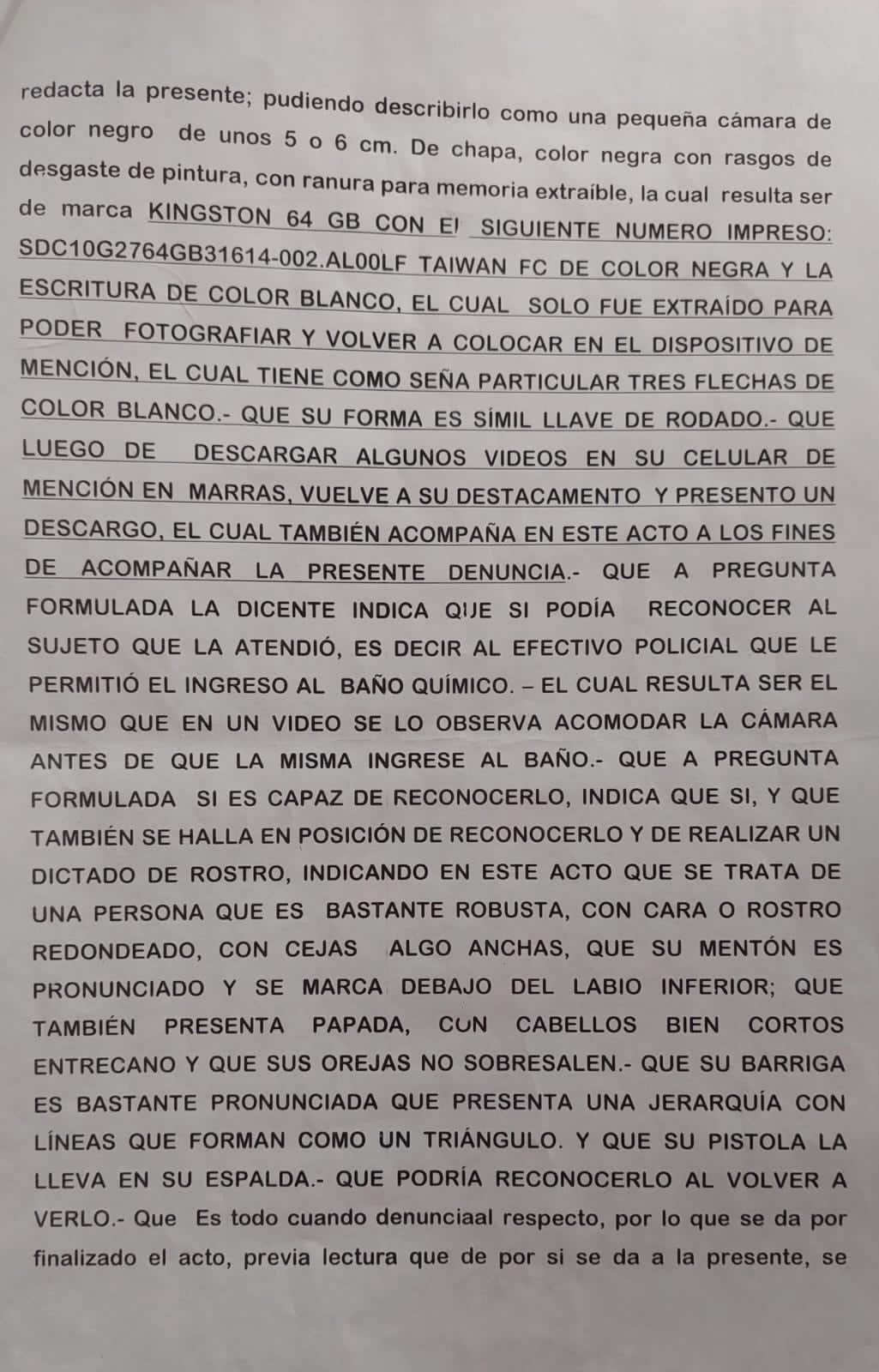 Según consta en la denuncia, la joven descubrió que algo raro sucedía cuando vio entrar al policía al baño químico. Luego de unos minutos salió, y ella le consultó a él si podía ingresar. Cuando lo hizo, le llamó la atención una bolsa negra ubicada al lado del inodoro.-ADVERTISEMENT-javascript:false