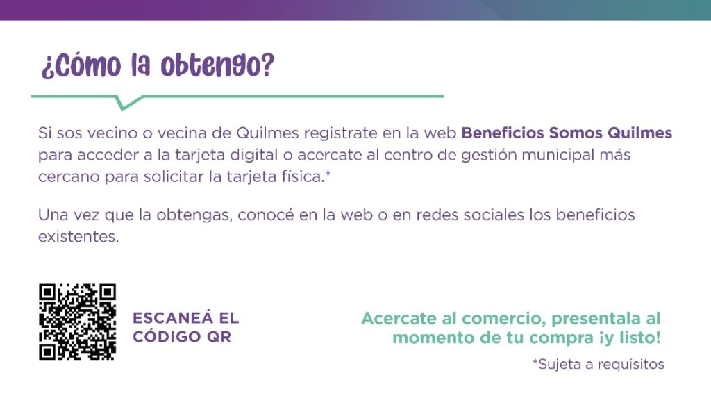 La misma es totalmente gratuita y abierta a toda la comunidad. Para obtenerla, los usuarios deberán registrarse en la app Somos Quilmes para acceder a su tarjeta personal, física o digital. La digital es para todos y todas, y se obtiene al registrarse en la web (http://quilmes.gov.ar/BeneficiosQuilmes).
