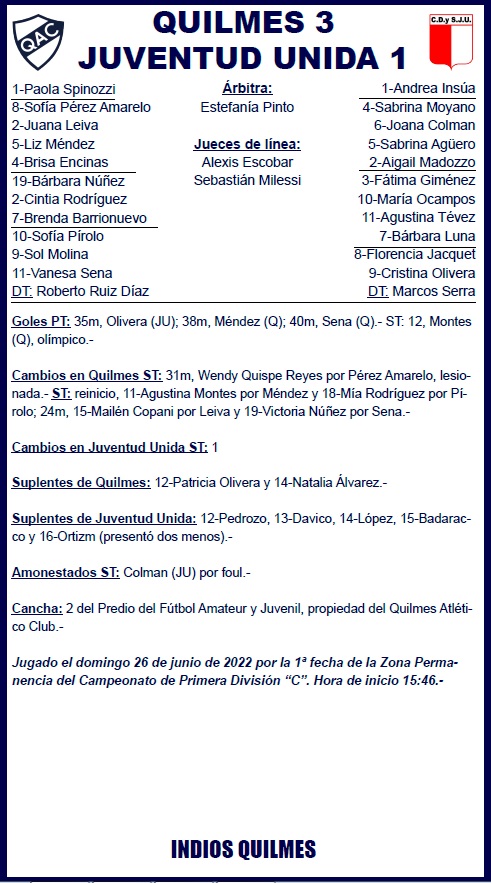 Un buen inicio tuvo el equipo en esta etapa con Roberto Ruiz Díaz al mando del primer equipo. Si bien tocó poco la formación inicial, Quilmes se mostró como un equipo protagonista y que ambicionó el triunfo de principio a fin ante un rival que, se espera, no tenga el protagonismo suficiente como para ser medida. Sin embargo, es de destacar que las cerveceras se repusieron a dos golpes en pocos minutos. Por un lado, la salida de Sofía Pérez Amarelo en camilla. La imagen fue fuerte a pesar de que en este deporte esas cosas pueden pasar. Por otro, al gol de Olivera. En pocos minutos, parecía derrumbarse todo. Sin embargo, Quilmes sacó a relucir algo que no le faltó este año: las agallas necesarias para ir a cambiar las cosas. Algunas veces no lo logró y en otras, como esta, se retiró con una sonrisa para alegría de sus hinchas y allegados.