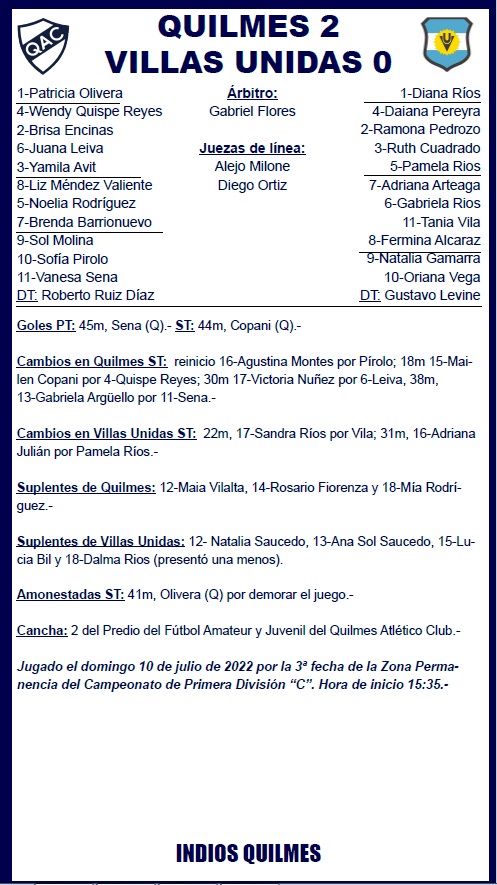 Quilmes venció 2 a 0 a Villas Unidas en el Predio de Alsina y Lora por la tercera fecha del Campeonato de Primera C. Vanesa Sena y Mailén Copani marcaron los tantos del triunfo.
