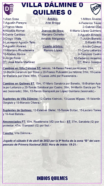 El mar de cambios que impuso el director técnico, Mario Sciacqua, dio resultados hasta ¾ de cancha. Allí, Quilmes se topó con el enjambre propuesto por José María Martínez, DT de Villa Dálmine. En la primera etapa, el Cervecero tuvo tres ocasiones de gol. Dos a través de Martín Río (un cabezazo se fue apenas alto) y un tiro de Carlo Lattanzio sin mucho peligro. Los centrodelanteros Federico Anselmo y Facundo Castro quedaron entre los tres marcadores centrales de los violetas. El peligro de Quilmes, en la primera parte, llegó gracias a las constantes subidas de Federico Tévez (combinado con Julián Bonetto) y Agustín Bindella (en sociedad con Iván Colman y Lattanzio).