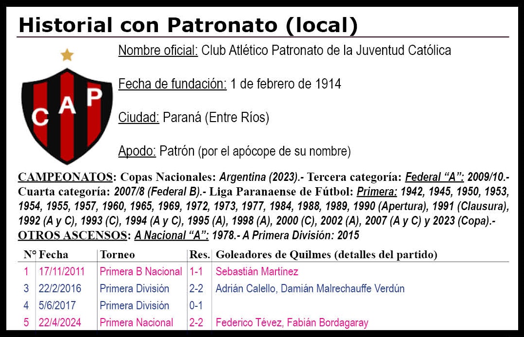 Quilmes enfrentó por primera vez a Patronato en 2011. Llevan jugados entre sí seis partidos y el Cervecero jamás pudo alzarse con el triunfo. Empataron en cuatro ocasiones y el equipo entrerriano ganó en dos. En goles, el Decano marcó siete y el Patrón, nueve.