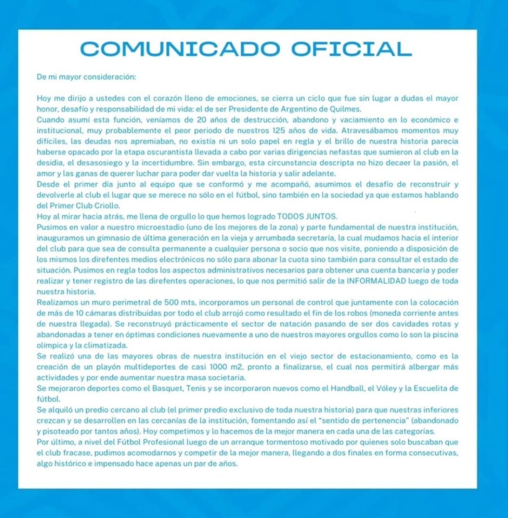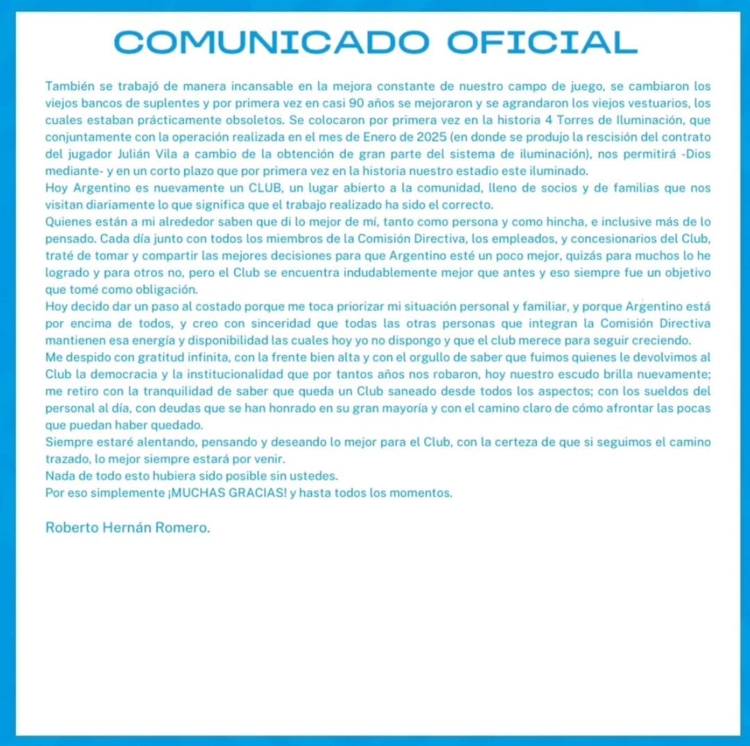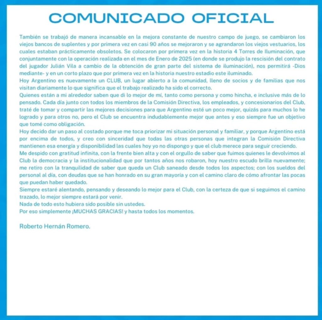 En la tarde de este lunes se confirmaron los rumores que al parecer hace tiempo se esperaba, el presidente de Argentino de Quilmes, Hernán Romero, y su vice, Gustavo Amadori, renunciaron a sus cargos. Según el comunicado que Romero posteó en su Instagram, la dimisión se debe a que quiere priorizar su situación familiar y personal, sin dar detalles. De mantenerse en la Comisión Directiva, la presidencia quedaría en manos del vicepresidente Eduardo Larosa. Resta esperar cuántos integrantes siguen el camino de Romero. Las elecciones en Argentino de Quilmes fueron en julio, cuando el oficialismo se impuso por un 76% de los votos a la lista encabezada por Leonardo Orellana.