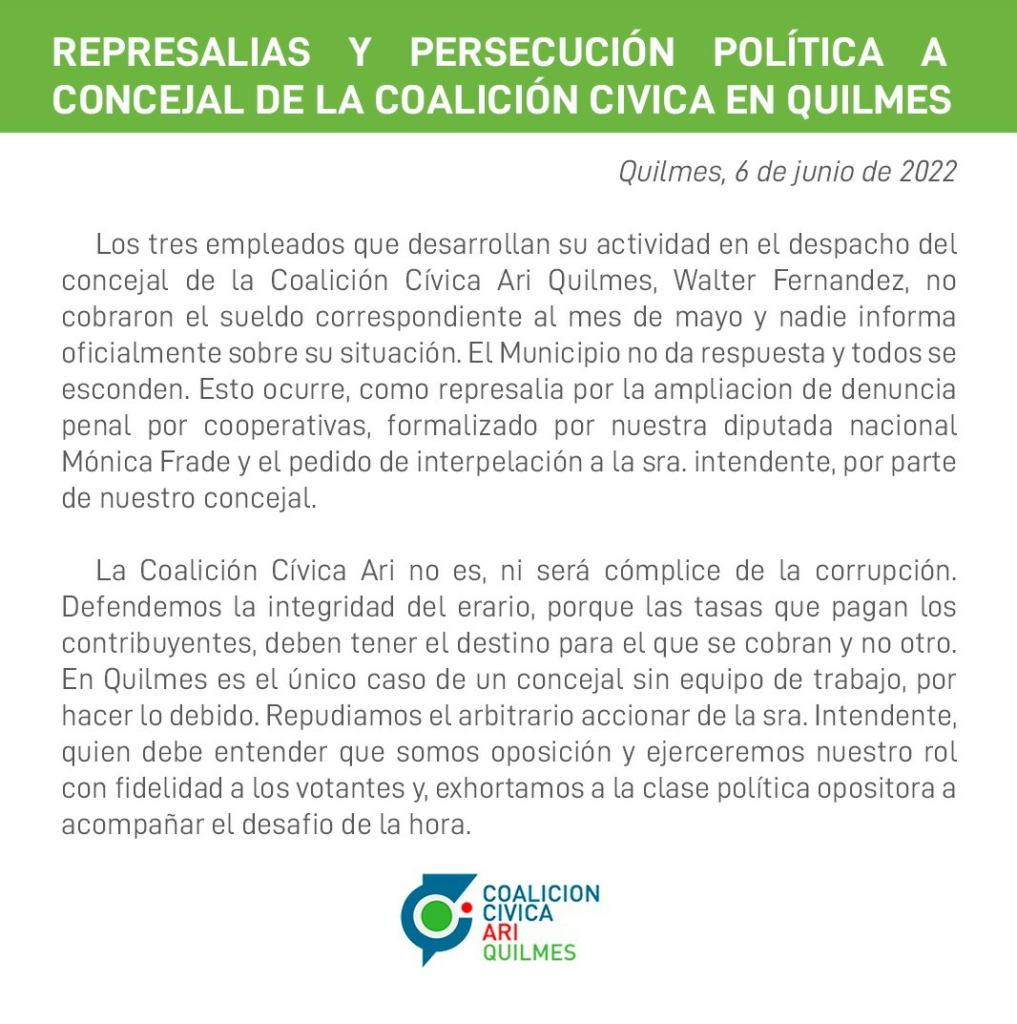 Desde su base política, suponen que es una represalia del oficialismo por las denuncias que hizo la diputada Mónica Frade, referente nacional, al gobierno municipal por manejos de cooperativas.