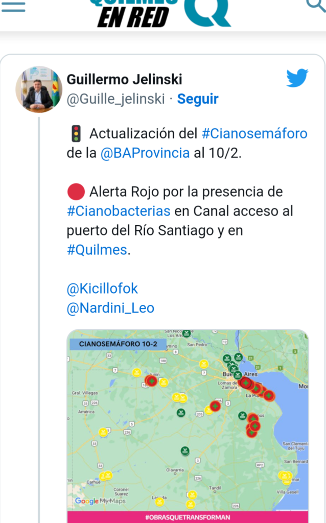 El Subsecretario de Recursos Hídricos Guillermo Jelinski publicó un “cianosemáforo” donde indica las zonas más complicadas.
