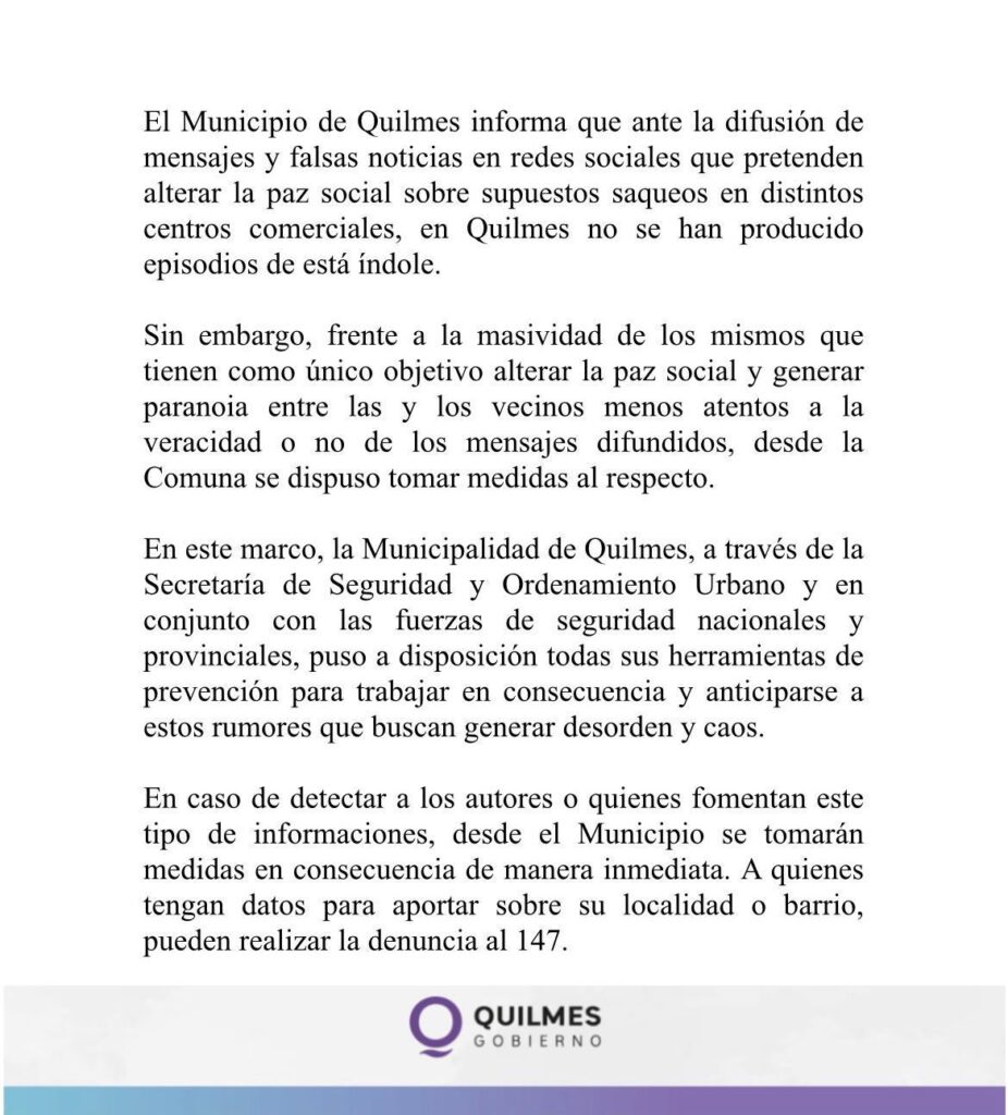 Durante la tarde cerraron negocios en Solano y hubo custodias en algunos comercios de Quilmes Oeste ante la sospecha de saqueos.
