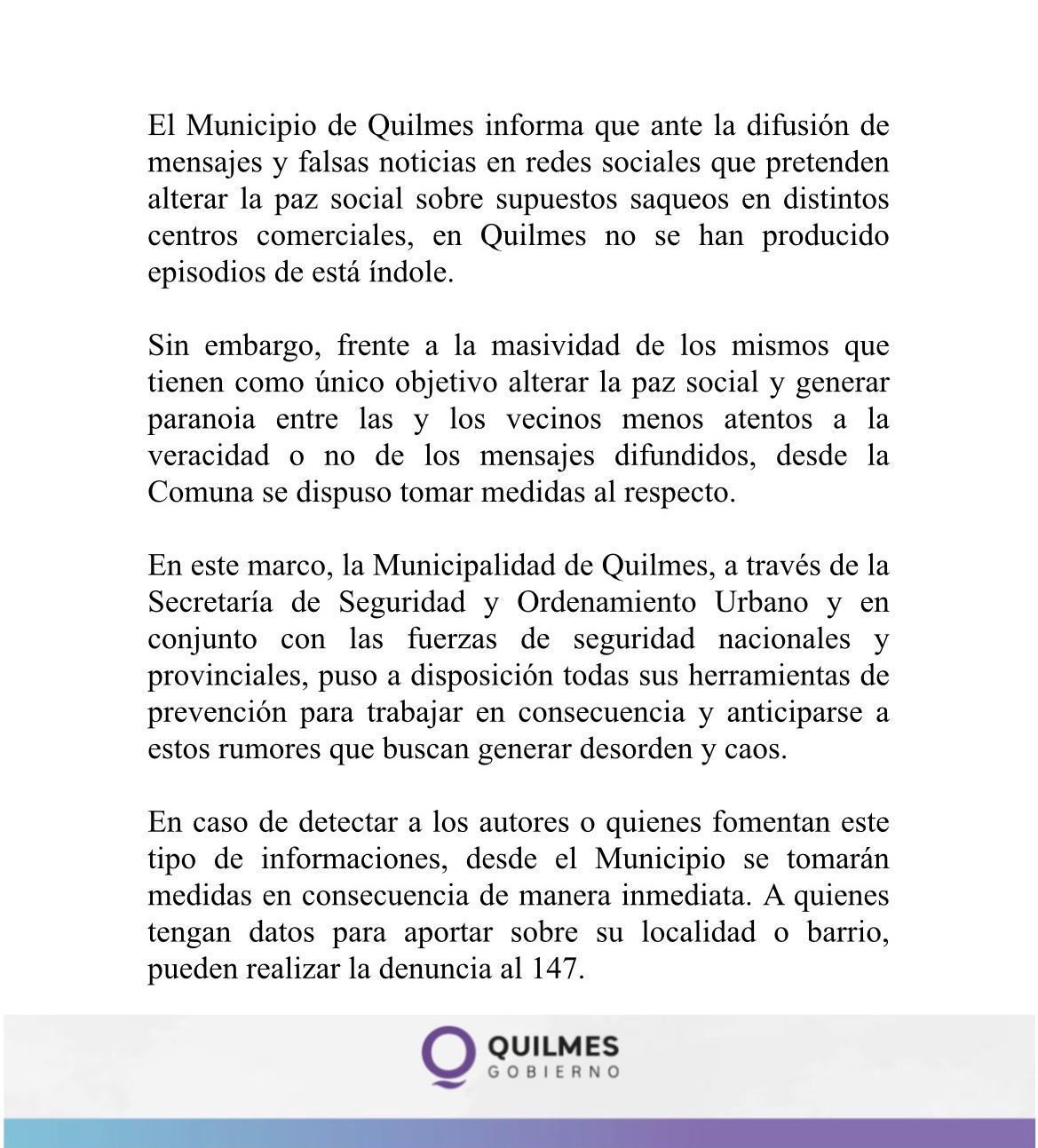 Durante la jornada, el Municipio había emitido un comunicado en el que se daba a conocer que se estaban instrumentando refuerzos en el área de seguridad.
