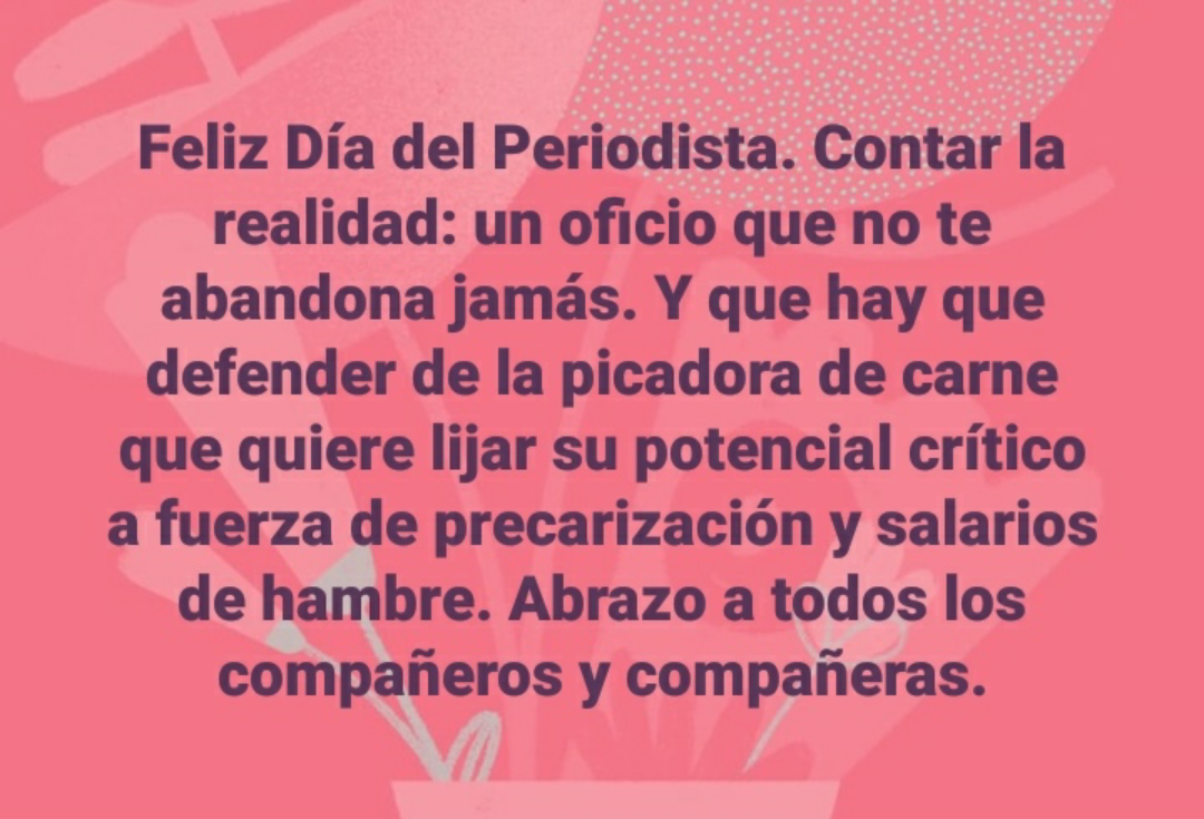 Saludo a cada trabajador y trabajadora de la prensa y los distintos medios de comunicación. Pido a Dios para que no falte el trabajo y sea bien reconocido, por su salud, por cada una y cada uno de ustedes y sus familias. ¡Feliz día del periodista!