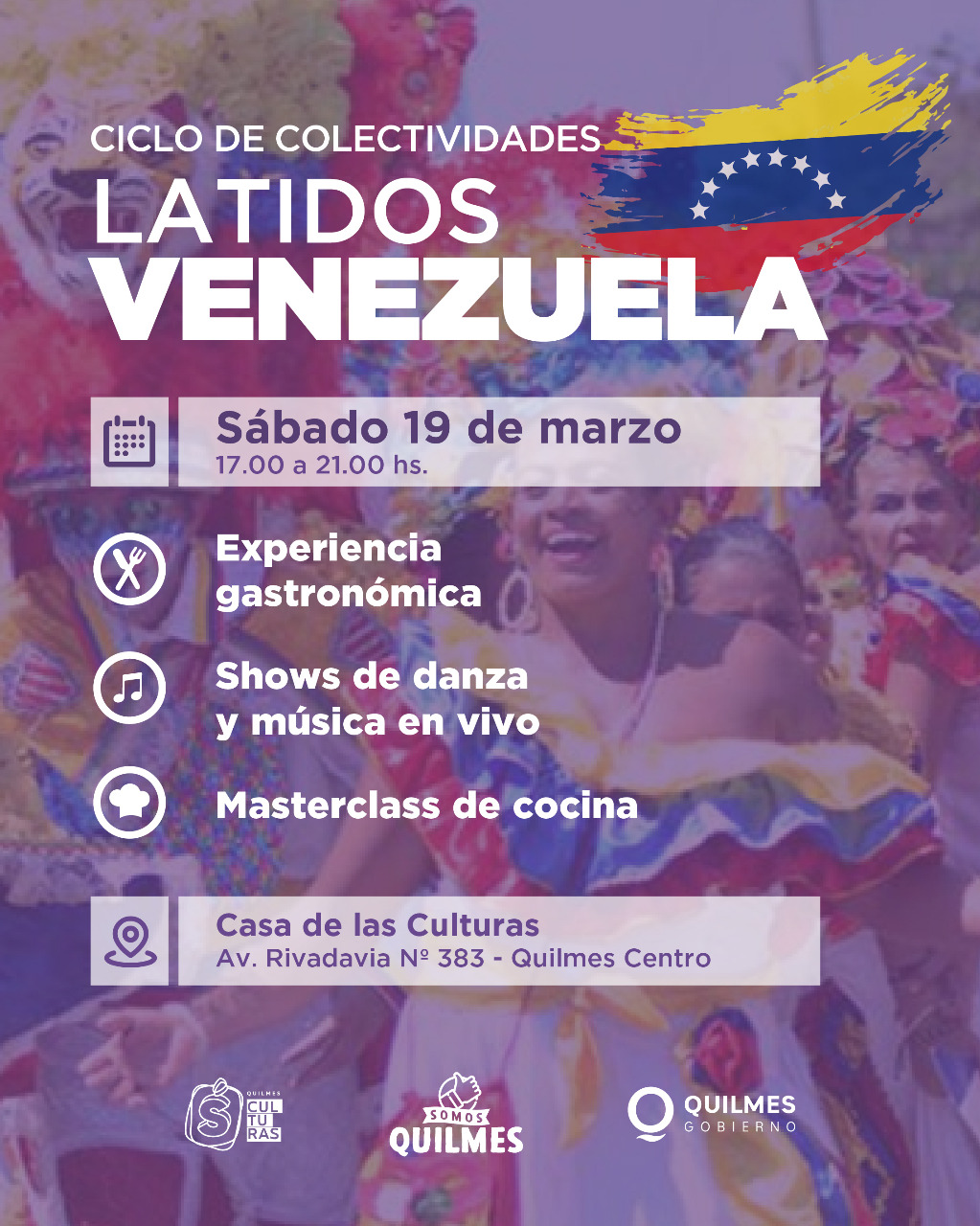 La Municipalidad invita a formar parte este sábado 19 de marzo de la primera edición del ciclo de colectividades Latidos. En esta ocasión el evento estará dedicado a celebrar la cultura venezolana en la Casa de las Culturas de Quilmes (Rivadavia 383 esquina Sarmiento), donde un sábado de cada mes nos encontraremos para conocer y festejar la identidad, cultura y tradiciones de las colectividades con mayor presencia en el distrito.