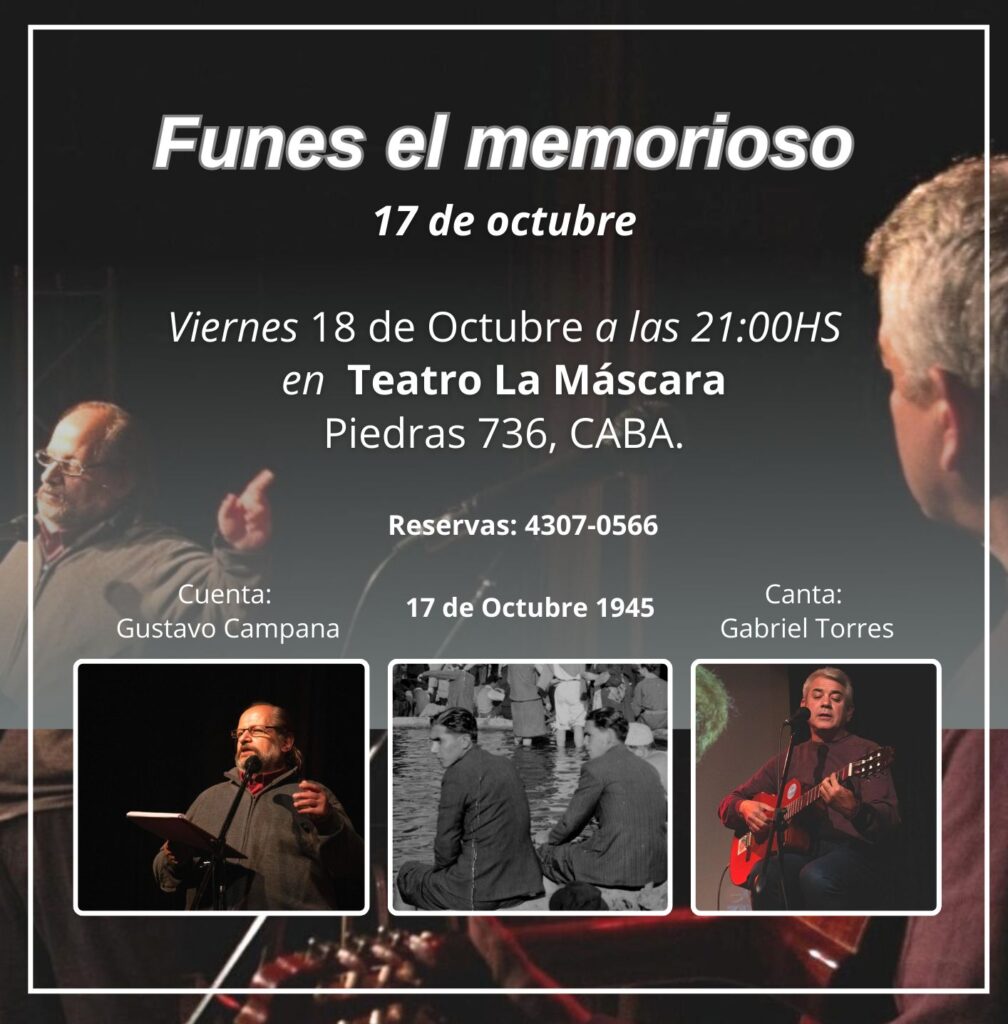 Este viernes 18 de octubre, fui al teatro La Máscara a ver Funes el memorioso, de Gustavo Campana y Gabriel Torres, una propuesta que trasciende los límites de lo teatral para convertirse en un acto de militancia y resistencia y nos invita a revisitar 200 años de historia argentina a través de un profundo enfoque artístico, literario y poético. En lugar de limitarse a una narración lineal o documental, el espectáculo se despliega como una sucesión de momentos históricos envueltos en una atmósfera lírica que evoca emociones poderosas.