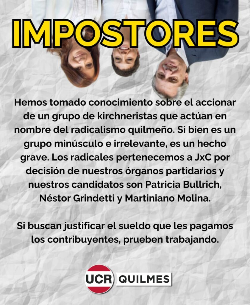 «Hemos tomado conocimiento sobre el accionar de un grupo de kirchneristas que actúan en nombre del radicalismo quilmeño. Si bien es un grupo minúsculo e irrelevante, es un hecho grave. Los radicales pertenecemos a JxC por decisión de nuestros órganos partidarios y nuestros candidatos son Patricia Bullrich, Néstor Grindetti y Martiniano Molina«.