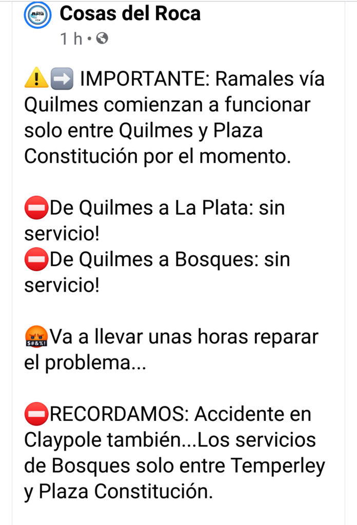 En su página oficial de informaciones, la linea del tren Roca advierte que hay demoras hacia La Plata a la altura de Quilmes.
