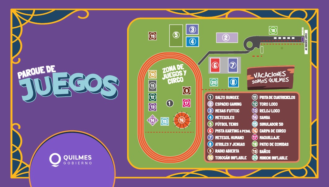El Municipio invita a los vecinos y vecinas a ser parte del «Parque de Juegos» que se desarrollará durante el receso invernal (sábado 19 al domingo 3 de agosto), con entrada libre y gratuita, en el Polideportivo Municipal Reynaldo Gorno (Vicente López y Lafinur, Quilmes O.), con actividades lúdicas, deportivas y muchas propuestas para los más jóvenes, en el marco del programa Vacaciones Somos Quilmes 2025.