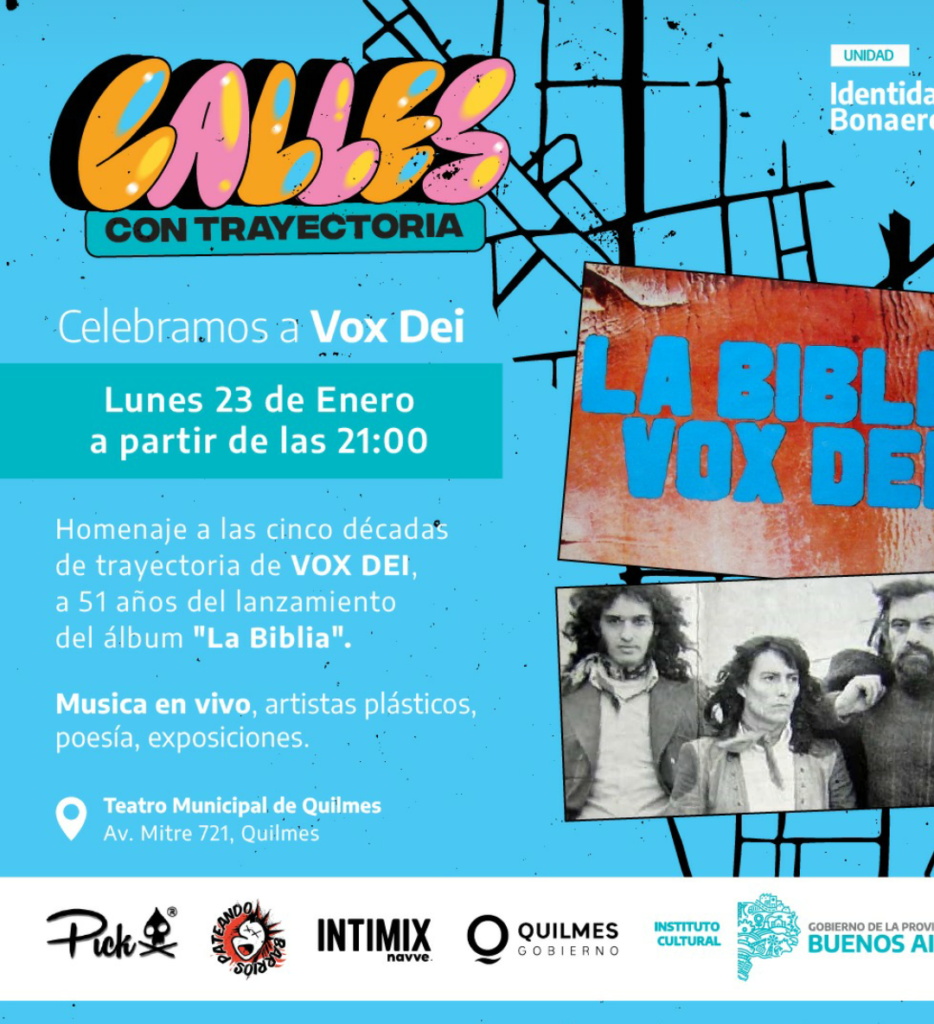 La jornada es articulada con la Municipalidad y las productoras Intimix y Pateando Barrios a partir de una iniciativa del Instituto Cultural de la Provincia, a través de su Unidad Identidad Bonaerense, para la edición de Calles con Trayectoria, que homenajea a personajes y referentes de la historia bonaerense. Es el caso de Vox Dei, banda fundacional del rock argentino que acaba de pasar el medio siglo de su creación.