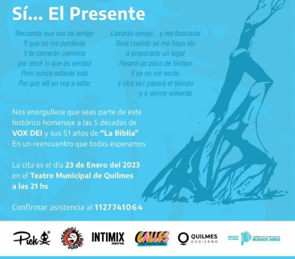 “El objetivo es homenajear a aquellas y aquellos que a través del arte en las ciudades y en los barrios, se los vio crecer. Mediante murales y música se intentará dar homenaje a una parte de nuestra cultura e identidad. Vox Dei representa mucho más que la banda responsable de una de las obras más notables, originales y osadas de la música nacional que es La Biblia, es un pilar ineludible en los cimientos del rock argentino, que comprendió la importancia de añadirle una visión y narrativas propias a una música que entonces se consideraba foránea. Su obra, aún vigente, abreva una identidad local sin perder una mirada universal y trascendente”.