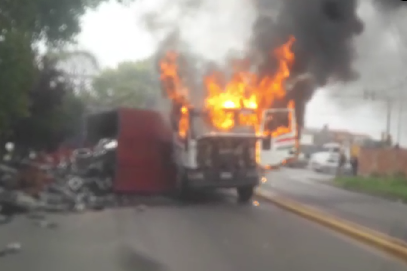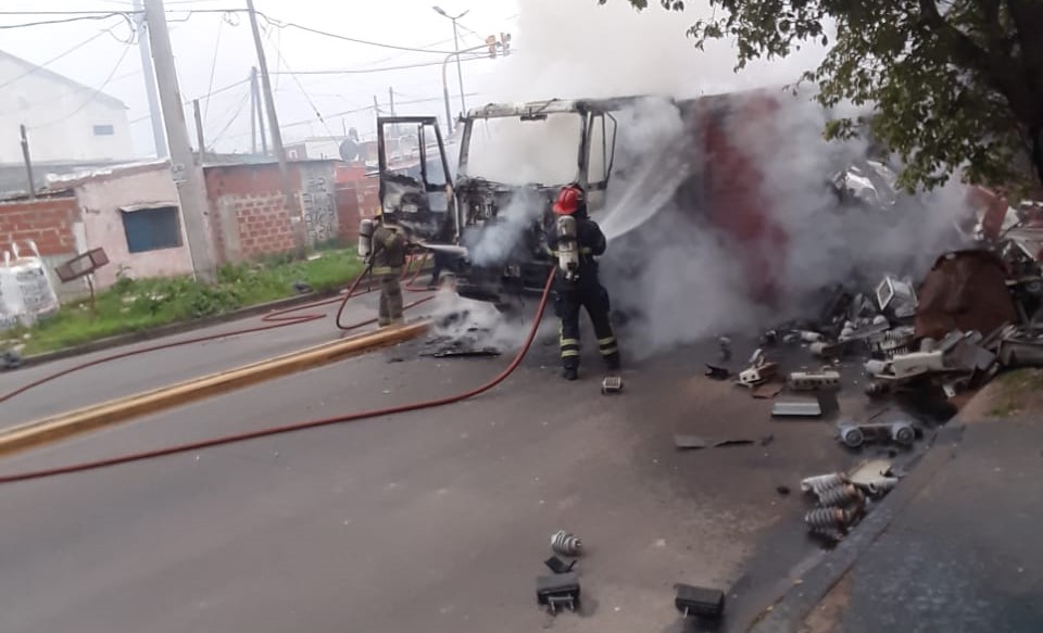 Minutos antes de las 13, un camión con pesada carga de chatarra que circulaba por Donato Alvarez, volcó al doblar en el semáforo de la esquina de Zapiola. Su conductor salió por sus medios. Minutos después, se prendió fuego la cabina.
