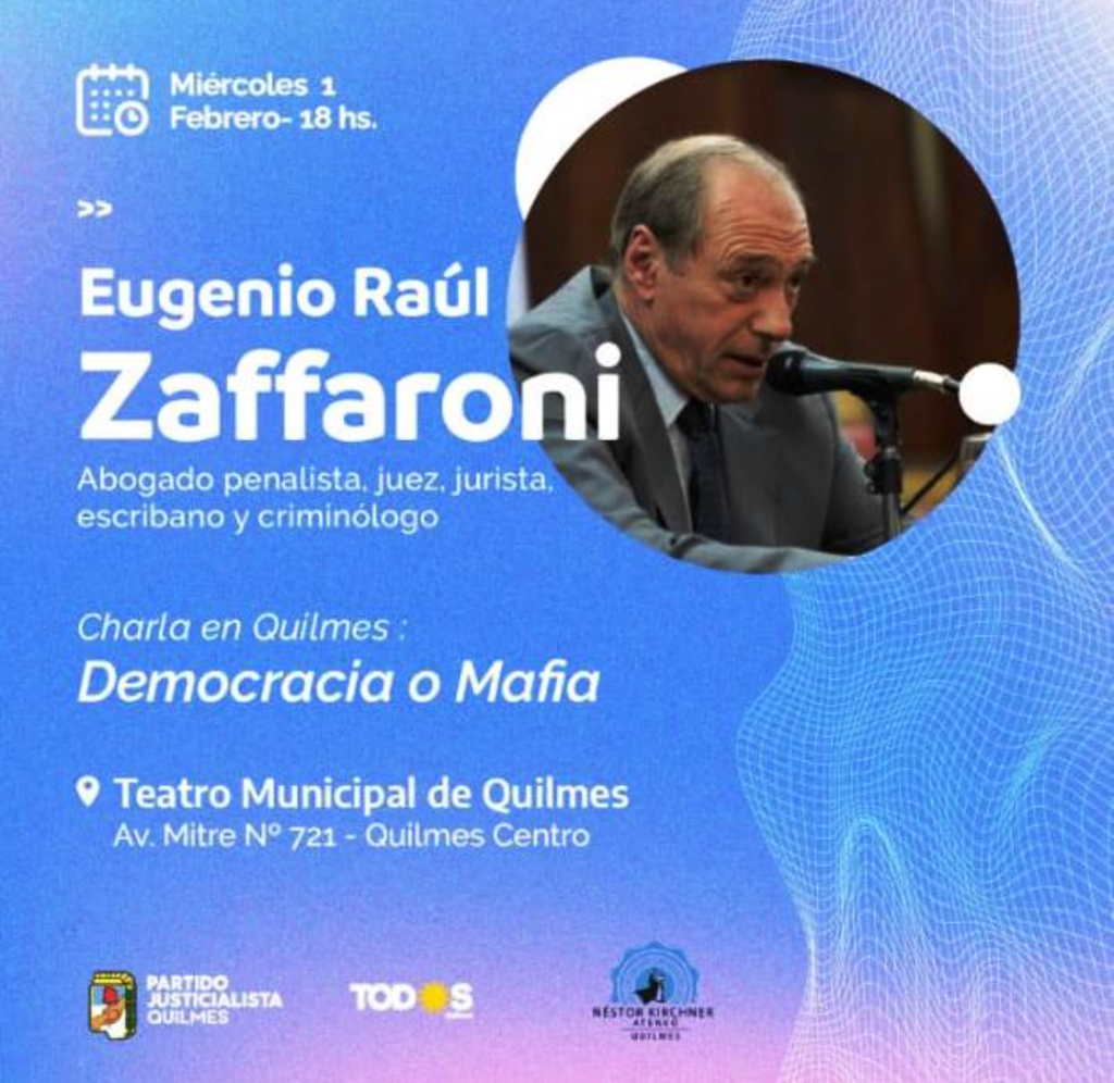 El PJ de Quilmes anunció que el miércoles 1° de febrero a las 18 se presentará en el Teatro Municipal el ex miembro de la Corte Suprema de Justicia de la Nación y de la Corte Interamericana de Derechos Humanos, el penalista Raúl Zaffaroni. La charla debate será con la consigna “Democracia o Mafia”. En sus redes, el PJ comunicó:
