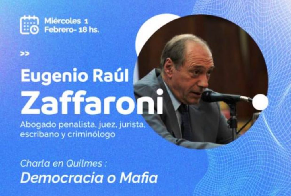 El PJ de Quilmes anunció que el miércoles 1° de febrero a las 18 se presentará en el Teatro Municipal el ex miembro de la Corte Suprema de Justicia de la Nación y de la Corte Interamericana de Derechos Humanos, el penalista Raúl Zaffaroni. La charla debate será con la consigna “Democracia o Mafia”. En sus redes, el PJ comunicó: